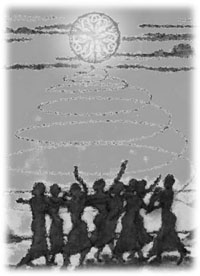 THE OLD buildings of Santa Fe, New Mexico are the colour of warm, red earth. Clay, baked in the desert sun, makes buildings strong enough to stand for centuries. Low, sturdy buildings they are, most of them, their sharp edges moulded and softened as by a potter's hand, standing under a deep blue sky. It was to this Spanish colonial town in the then wild west that five nuns from the moist green landscapes of Kentucky came in 1852, to build a school and -of course - a chapel. Only when it was finished, did the sisters discover an oversight. There was no way to get from the ground floor to the choir loft unless they removed most of the chairs to build a staircase - or scrambled up and down a ladder in their robes. They liked neither option. Turning for help to their patron Saint, the master carpenter St Joseph, the nuns made a novena. Nine days of concentrated prayer. On the ninth day, a mysterious visitor came to the door of the chapel, a wandering carpenter with a donkey. He carried nothing but three tools - a hammer, a saw and a T-square. The stranger told the nuns he could fix their problem if they would supply tubs of water in which he could soak planks. The tubs provided, he set to work. The result - a spiral staircase of thirty-three steps. But this was no ordinary spiral staircase. Twenty-two feet tall, with two complete 360-degree turns and without a central support of any kind, it relied for its strength on nothing but its own geometric balance and design. And it contained neither nails nor screws. It was - and still remains - a thing of rare beauty and perfection. The stranger asked no payment, and when the job was completed he immediately disappeared. Wanting to thank and reward him, the nuns searched all around the district, but no-one had seen or heard of him. No-one knew where had slept, no-one had fed him. No timber had been purchased anywhere nearby. The timber he had used to make the stair was of a kind unknown in that area. Of the mysterious master carpenter there was no trace. I read recently that in 1965, a tourist by the name of Oscar Hadweiber, himself a third generation master carpenter, saw and admired this magnificent piece of carpentry and remembered that his German grandfather, Johann Hadweiber, had come to the USA in the late 1800s and had spent two years in Colorado and New Mexico. According to family lore, he was said to have built a staircase somewhere in the west. The staircase had been constructed in 1878. The dates tallied. Oscar sent a letter to the current Loretto nuns to say that he was fairly sure his grandfather had been the builder. Although the nuns must have been disappointed at the thought of losing their legend, they said they were willing to accept his story, provided that he could produce conclusive evidence. Five years later, Oscar claimed to have found a faded sketch of the staircase in his grandfather's old toolbox. But the sketch was never authenticated and has since disappeared. Oscar himself died in 1980. Much as I felt for Oscar who, like so many of us, was keen to deepen his own sense of belonging in the world by thawing out the frozen stories of his personal ancestors, I found myself feeling glad that he never succeeded in his quest to identify his grandfather as the stranger who built the staircase. Miracles and mysteries are precious. The are the seasoning that gives flavour to a mundane life; the brush of sacredness that deepens the colours of all things ordinary. They frost the edges of a humdrum day so that it sparkles with new meaning. If the wounds on the hands of St Francis were found by modern scientists to have been psoriasis, if the apparitions of Mary turn out to be collective psychosis or someone proves that it was really Johann Hadweiber, and not St Joseph, who built the spiral staircase of the Loretto Chapel in Santa Fe, then something special will be lost. Mysteries and miracles keep the door of reason propped ajar just a little. Just enough to remind us that we are not totally in control of everything under the sun. Let's hope that door never slams completely shut. If it does, then hopefully someone, somewhere, upon hearing the bang, will think of having us all do a novena. And let's trust that on the ninth day of our concentrated prayer, a strange visitor will come, on a donkey, carrying only a saw, a hammer, a T-square, to build again for us the possibility of miracles. CALL FOR SUBMISSIONS Don't be shy - send in your writings, your thoughts, your poetry, a book or website you have found, an announcement that you think would be interesting to others, a comment on one of these articles, an anecdote, a new discussion topic - whatever snippet you want to share. I want this to grow into a forum for exchanging ideas and experiences, a place to network. So please - send me your words. Also, send me your ideas on the sorts of things you would like to read in the newsletter. I had thought to run an article on dreams, and ways of working with them, but no-one has yet dared to send me a dream to work with. Have you had a really interesting/unusual/meaningful or puzzling dream lately that you would like to share? (You can remain anonymous if you prefer). |