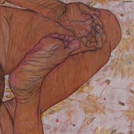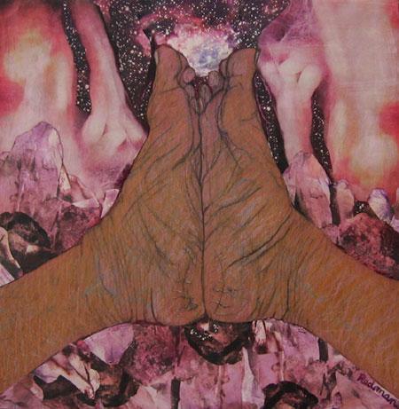 Most mornings I awaken my body and spirit by doing Yoga or Qi Gong. As I slowly move through the postures, I become part of the beauty of my garden. But what manifests in my art is often a particular fallen leaf or my moving hands and grounded feet. In "Celestial Rub," the soles of my feet have come together in a Yoga asana called the butterfly. Once in the studio, I recreate this pose. Sitting, looking down on my body, I draw my feet (which go numb by the time I finish). After delineating the foot's contours, I use colored pencil to add flesh tones to the wood grained panel that is my original surface. Then I consider figure/ground relationships. My imagination begins to play with what's above and what's below, illusion and solidness. I select images from my collected files of earth, universe and humanity-- repeatedly photocopying crystals, starbursts and an image that appears to be bone and connective tissue. I cut and tear these secondary images into shapes to fit around the feet and then collage them into place with acrylic medium. By repeatedly glazing the acrylic medium over all the surfaces, what is drawn, painted and collaged unifies into one field. The wood panel itself adds to the cracks and fissures of my feet, becoming part of my ongoing exploration of worn and furrowed forms, of flesh marked by time and change. In this new work from my Aging Into Full Creativity series, some kind of magical thinking has overtaken me at the very time that I am searching for footing, for ground, for center. It amazes me as I travel my path as an artist and aging woman how the journey seems more and more related to spirit. Although this work is based on very focused observation and physical detail, it seems to move me towards mystery as I follow the textures, shapes and images that keep evolving. Seeing ourselves as part of life's continuity, whether we are currently young or old, seems essential for our well being and the earth's survival. And even though I don't know how to write poetry, these words came to me and found their way from the art to the page: HEEL TO HEAL /SOLE TO SOUL